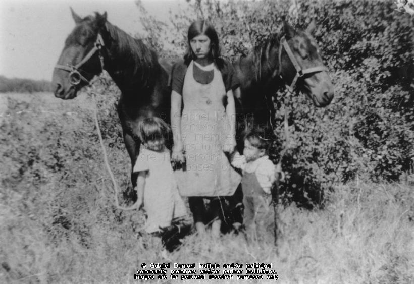 Photograph of Victoria (Sayer) Pelletier holding her children’s hands, and they are each holding the reigns of a horse. Only the horse’s heads are visible, as the horses have most of their bodies positioned behind the people. Victoria is looking away from the photographer and she is wearing a light coloured dress over a dark shirt. Mary (left) is wearing a white dress and Isador (right) is wearing overalls. Mary is the future Mrs. John Lafontaine. |
